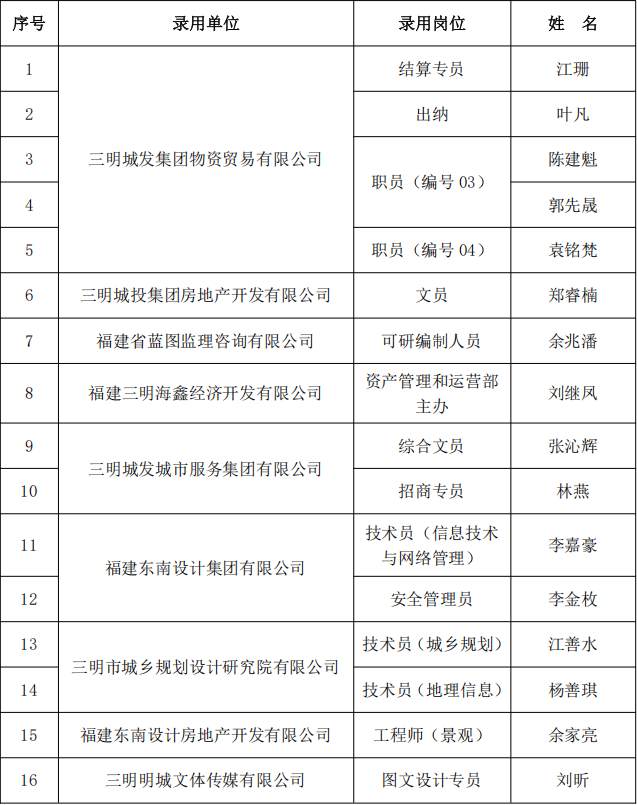 2025年4月17日发布的招聘公告,通过报名、资格审查、面试、笔试等程序,现将拟录用人员名单公示如下: