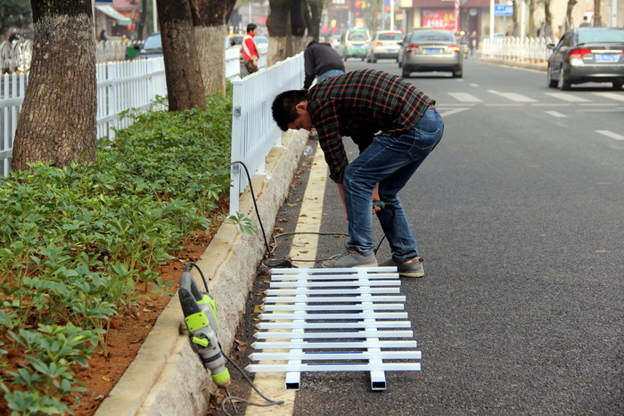 近日来,工人们正在加班安装东新四路隔离带栅栏。东新四路是市区主要交通通道,改造后变成双向四车道,有效地改善了交通条件。同时,在改造时保留原有的“香樟隧道”,使之成为市区最绿的一条路。